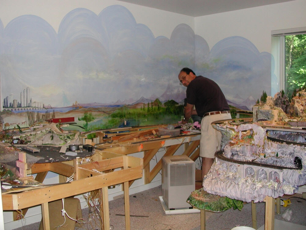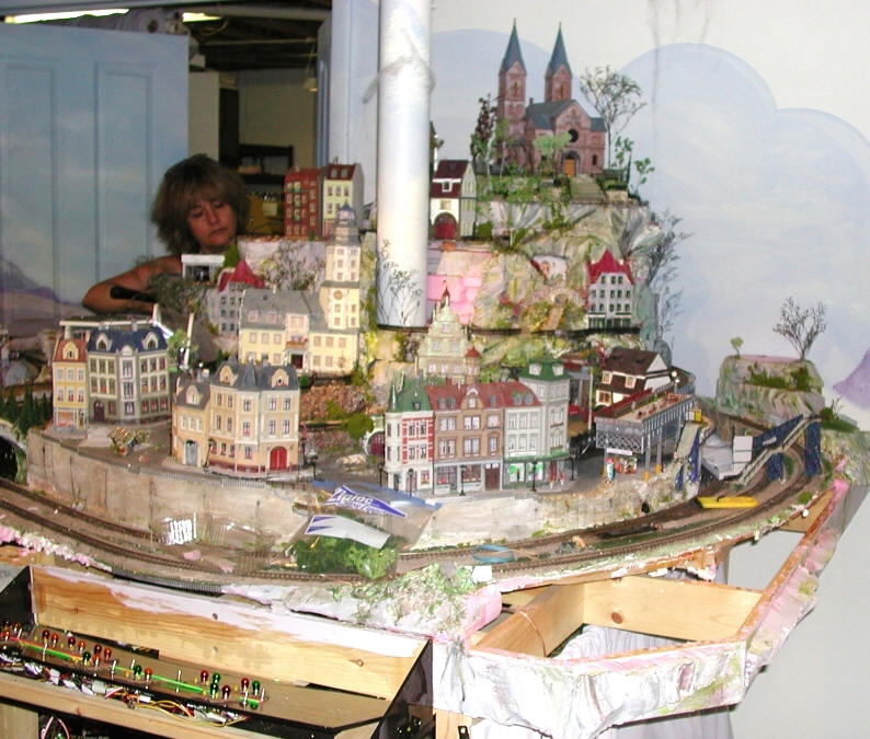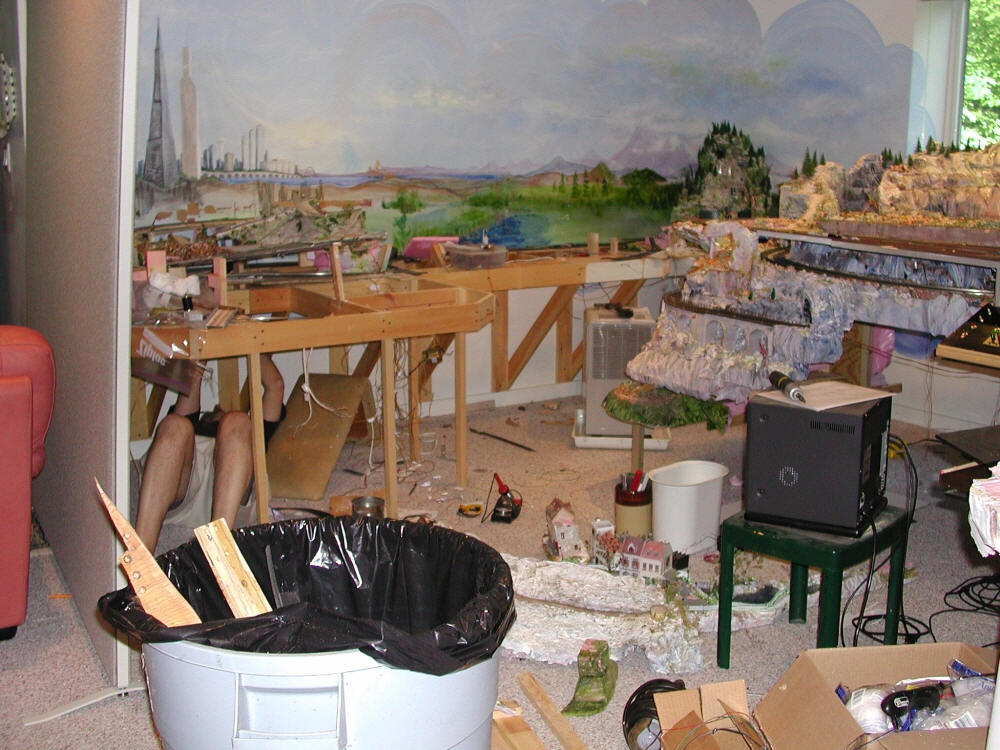 Oh no! We're moving! Train Deconstruction is underway. We're dismantling chunks of scenery and the frame to be transformed into a larger layout, about 14 feet longer, in our new home. July, 2003 Here's Irene trying to pry off the top level of the old town. Not a happy camper. She's thinking, "I have to paint this background over again. How am I going to get it as nice?"
