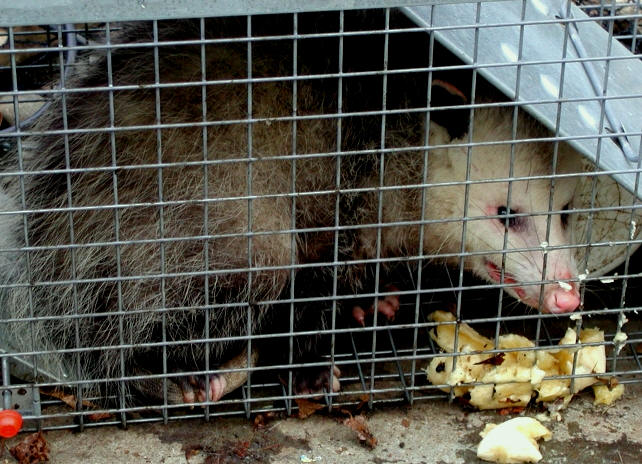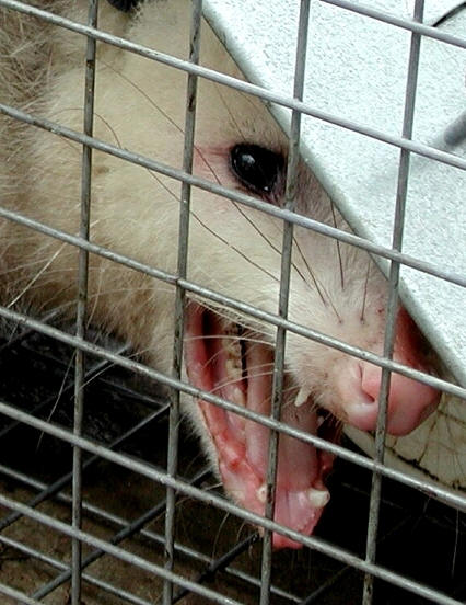 Well, he came, got trapped and Irene thought he was a giant rat. Ugh! John, who would have dealt with him was away. Irene "invited" him to dinner after 2 days when she surfed the web and ID'd him as an opossum. A Marsupial! Despite how they look, opossums are not nuisance animals and are important to local ecology. She contacted the National Opossum Society, who told her opossums die fast without water. Ulp! But, it's so ugly and how do you spring the trap? YUK! Where's John when you need him! It worked out though. The local police came and sprang him. Don't come back! March 2002.