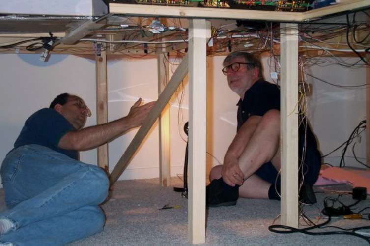 Working under the table, July 8, 2000. John and Mentor Alan are trying to set